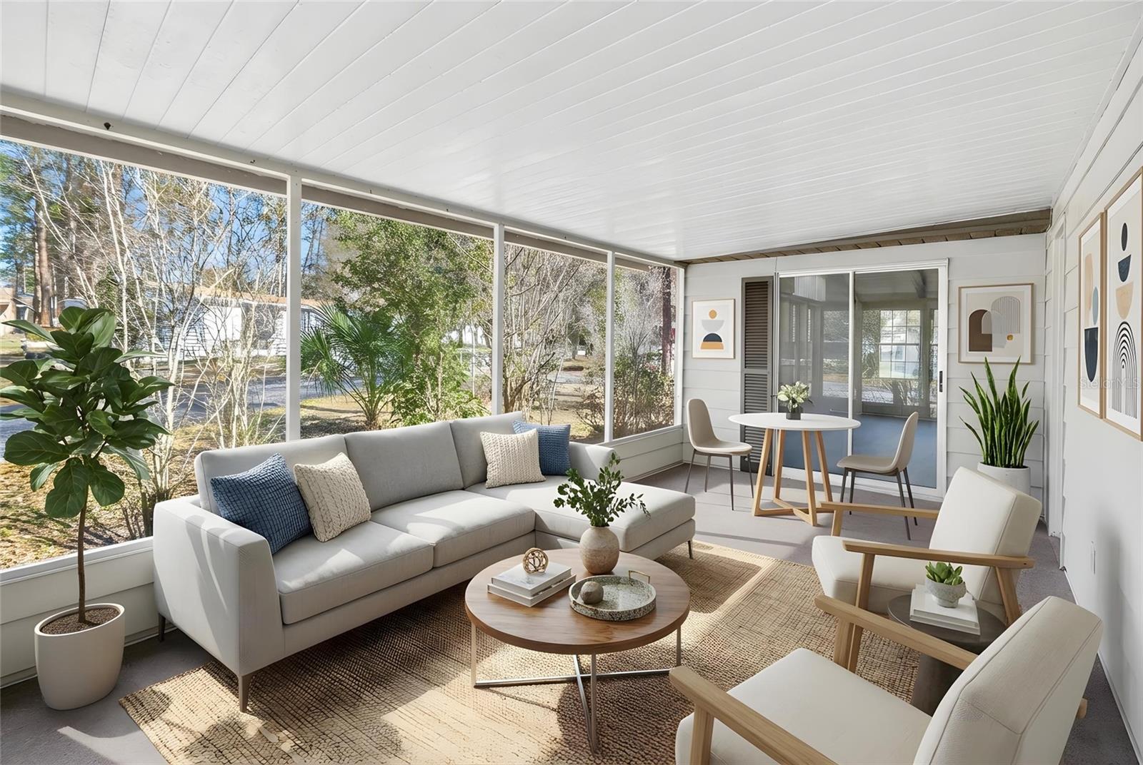 One or more photo(s) has been virtually staged. Welcome home to Turkey Creek Forest, a 55+ community in Gainesville, FL. This 2 bed/2 bath Manufactured Home sits on a corner lot with 1,640 sq ft of living space with new flooring and sub-flooring throughout. Step inside to a light-filled, oversized living room with large windows that bring the outside in. The dining room is off the entry. The kitchen has plenty of counter space, cabinetry and a breakfast nook for your morning coffee. Breakfast nook could also be a craft room or office. Both bedrooms are good sized and located at the back of the home for privacy. The primary suite bathroom features a walk-in shower, while the hall bath offers a tub/shower combo. A dedicated utility room with washer and dryer leads out back to a double-sided storage shed. The screened front porch is the kind of space you will use often. Park under the carport or in the driveway Enjoy a corner lot that gives you room to breathe with low-maintenance landscaping. Turkey Creek Forest offers gated and guarded access from dusk to dawn. Community amenities include a clubhouse, heated pool, shuffleboard courts, tennis courts, pickleball, meeting rooms, walking trails and an active social calendar. The HOA is self-managed. Conveniently located near Hunters Crossing shopping and dining. Near medical facilities and the Walmart Supercenter.